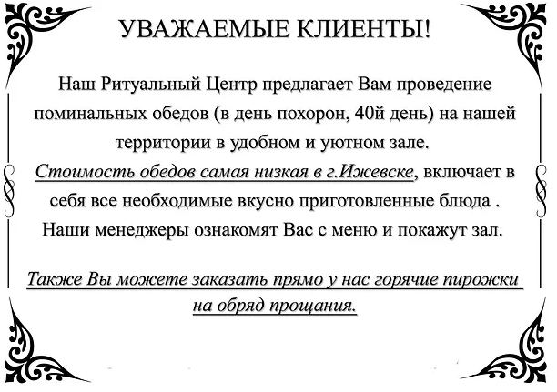 После проведения церемонии погребения, согласно традициям, проводится поминальный обед по покойному. Поминки также проводятся и на 40й день. Мы предлагаем провести поминки в уютном поминальном зале на территории нашего предприятия. Аренда помещения бесплатно, без посторонних, стоимость обеда – самая низкая в городе Ижевске. Также возможна доставка поминального обеда на дом. Если по каким-либо причинам проведение поминального обеда на нашей территории неприемлемо, то мы поможем выбрать другое кафе или ресторан.